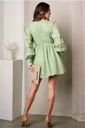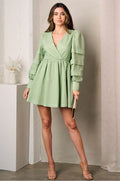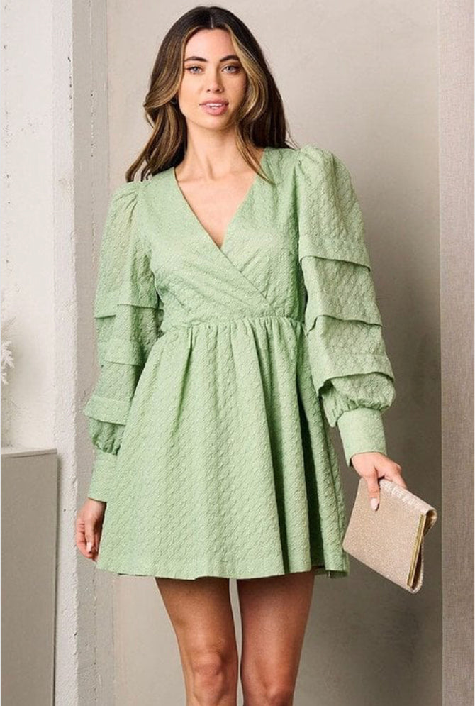 Description: Textured surplice dress with tiered puffed long-sleeves and lining